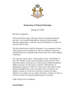 You, the great nation of Iran, affectionately call me “The Mother of Iran. The “Mother of Iran” joins all mothers in Iran who have been denied the right to mourn the loss of their dearest children during this ruthless massacre. For this reason, I declare a National Day of Mourning on January 23, 2026 to be observed by all freedom loving Iranians throughout the world, and request that we all join in one minute of silence at 12:00 noon, local time, to honor our fallen children.