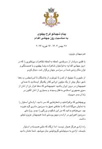 راه آزادی هرگز هموار نیست؛ اما آن‌گاه که ملتی همبسته و استوار بایستد، آزادی به سرنوشتی گریزناپذیر بدل می‌شود. شما نشان دادید که ملت ایران، فراتر از قاره‌ها، اقیانوس‌ها و نسل‌ها، یک ملت یکپارچه است.