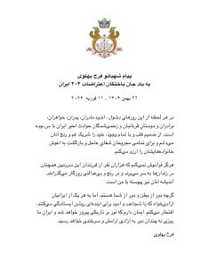 گرچه دور از وطن و دور از شما هستم، اما به هر یک از ایرانیان آزادیخواه که با شجاعت و امید برای آیندهای روشن ایستادگی میکنند، افتخار میکنم. ایمان دارم که نور بر تاریکی پیروز خواهد شد و ایران ما روزی نه چندان دور به آزادی آرامش و سربلندی خواهد رسید.