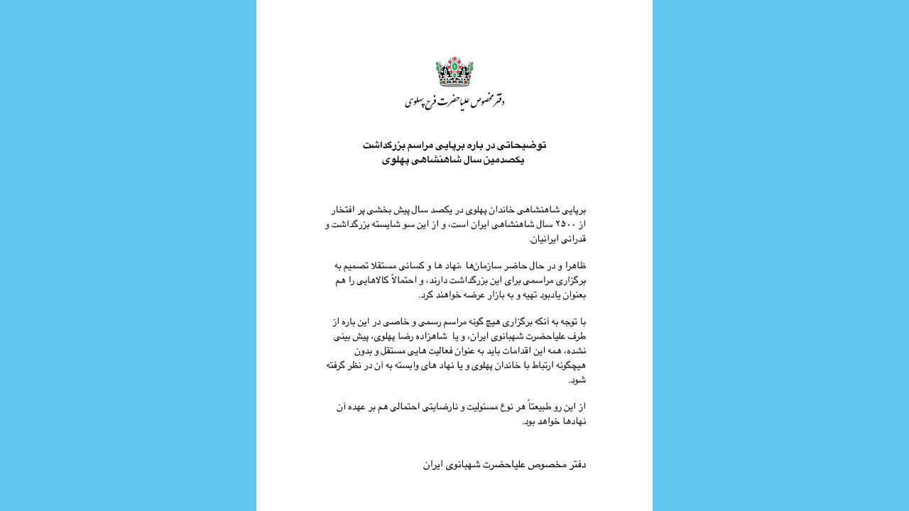 با توجه به آنکه برگزاری هیچ گونه مراسم رسمی و خاصی در این باره از طرف علیاحضرت شهبانوی ایران، و یا  شاهزاده رضا پهلوی، پیش بینی نشده، همه این اقدامات باید به عنوان فعالیت هایی مستقل و بدون هیچگونه ارتباط با خاندان پهلوی و یا نهاد های وابسته به آن در نظر گرفته شود.