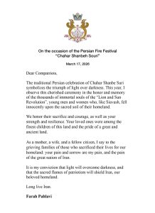 The traditional Persian celebration of Chahar Shanbe Suri symbolizes the triumph of light over darkness. This year, I observe this cherished ceremony in the honor and memory of the thousands of immortal souls of the “Lion and Sun Revolution”, young men and women who, like Siavash, fell innocently upon the sacred soil of their homeland.