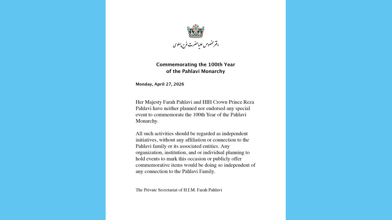All such activities should be regarded as independent initiatives, without any affiliation or connection to the Pahlavi family or its associated entities. Any organization, institution, and or individual planning to hold events to mark this occasion or publicly offer commemorative items would be doing so independent of any connection to the Pahlavi Family.